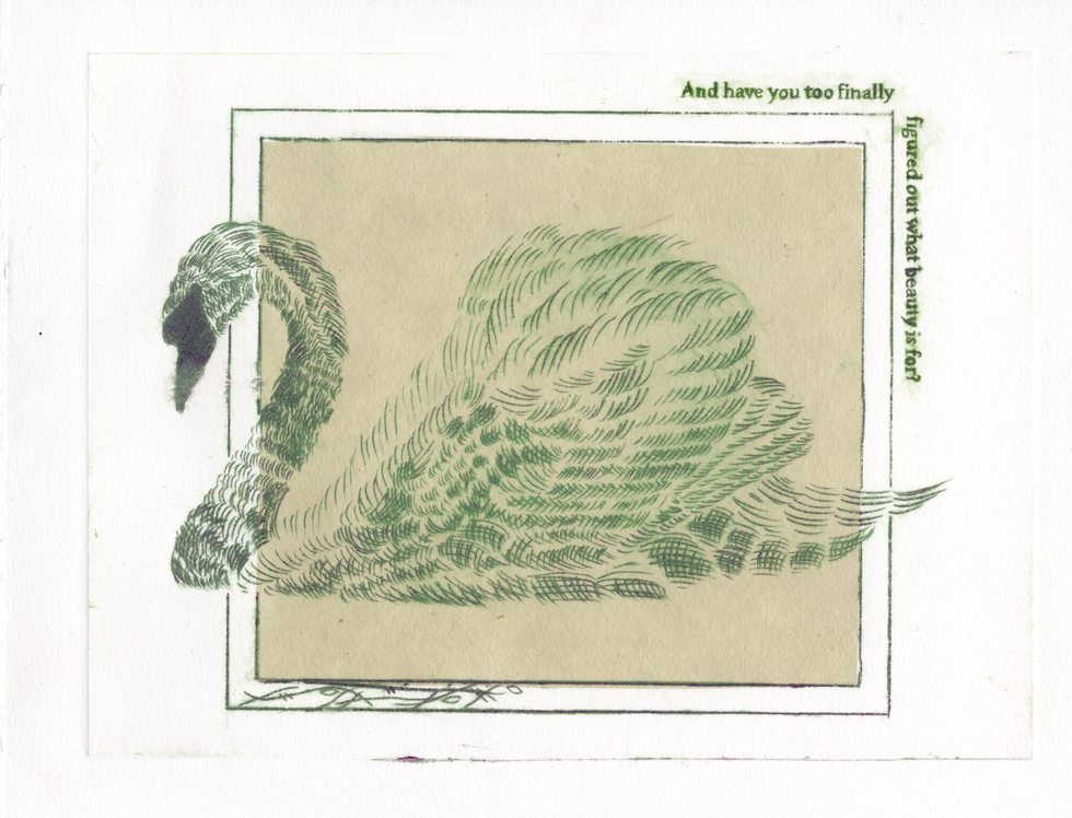 Fiona Kubalak, swan 3, 2023, dry point & chine collé, 6x9